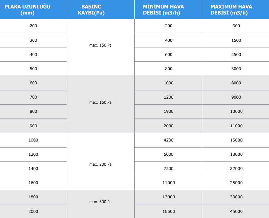 Yukarıdaki eşanjör boyut ve debi parametrelerini göz önüne alarak aşağıdaki tabloyu doldurabilirsiniz.